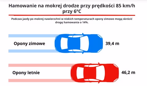Opony zimowe, dzięki swojemu specjalnemu bieżnikowi i mieszance gumy, mają lepszą przyczepność. Dzięki temu skracają nasza drogę hamowania zarówno na śliskiej, jak i mokrej nawierzchni. Badania przeprowadzone przez TUV SUD Polska wykazały, że poruszając się na mokrej nawierchni przy niskiej temperaturze, opony zimowe mogą skrócić drogę hamowania nawet o 14%.